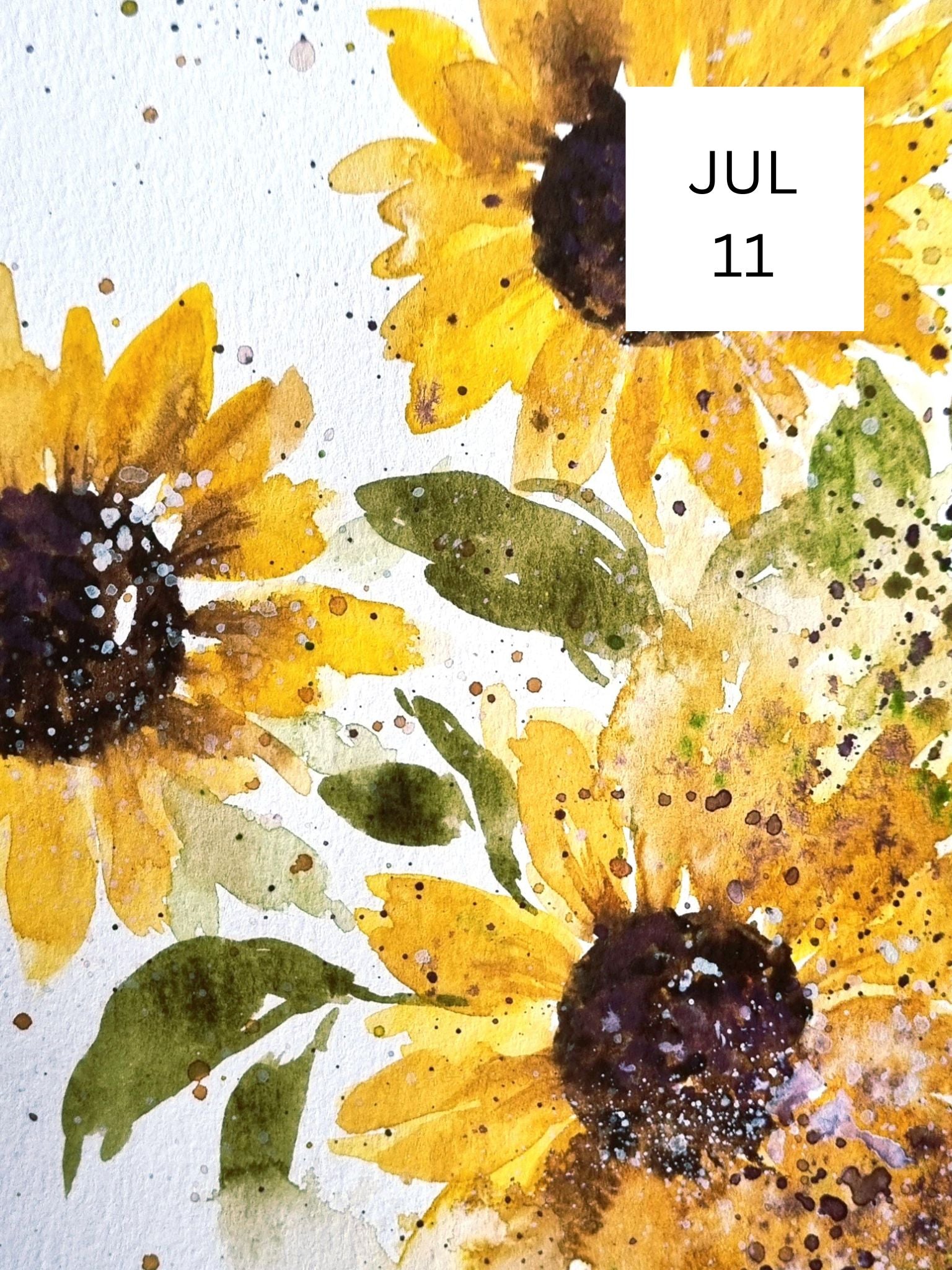 You’ll be guided through exercises that help you loosen up and let colours blend naturally on the page. The focus will be on playful brushwork, simplified petals and foliage, and embracing happy accidents to create expressive, lively sunflowers. You will also learn how to add fun textures like splattering, lifting, wet on wet blooming.